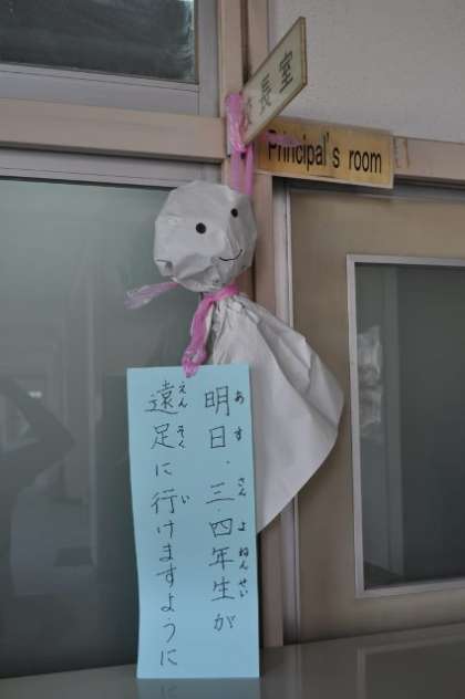 遠足前日の天気予報では、当日は朝から雨ということでした。そこで、校長先生が校長室前に「スーパーてるてるぼうず」を吊るしていたのですが・・・。その甲斐あってか、当日朝は曇り空ながらも、雨は降っていませんでした。昼には雨が降り出すという予報だったので、雨具をもって遠足に出かけました。