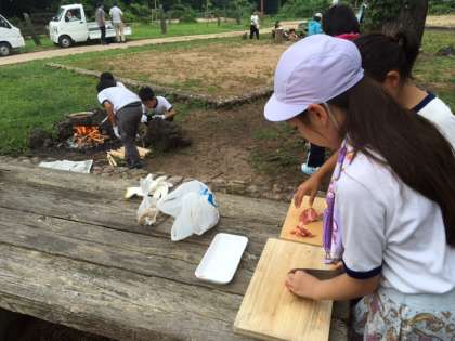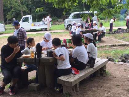飯ごう炊さんは、班ごとのカレー作りです。調理の経験が少ない、ましてやかまどに火をおこし調理することなど初めてという子どもたちがほとんどなので、何よりもグループでのチームワークが問われます。大きな火を薪でおこすためには、薪の組み方や空気の通り道を確保することが大切です。また、料理は段取りが大切なので、準備や後片付けもみんなで協力し合わなければうまくいきません。悪戦苦闘しながらも、みんなで力を合わせ、どのグループもおいしいカレーライスを作ることができました。でも、おいしかったでは終わりません。食べた後には、後片付けが待っています。鍋や食器はきれいに洗えているか等、厳しい点検を受けます。しっかりと洗えていなければ、何度でもやり直しになります。これも貴重な経験です。