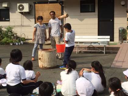 杵を持たせてもらい、1人5回ずつつかせてもらいました。腰を入れて強く杵を振り下ろすことはなかなか難しいのですが、36人もついていると、立派な餅につき上がりました。つきたての餅は、きな粉餅にしてもらい、おいしくいただきました。