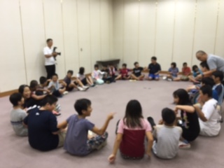 最後はみんなで円になり、後ろの人の膝の上に座るという「人間いす」に挑戦しました。みんなの息がぴったり合わなければ成功しないのですが、4回目で見事、決まりました。