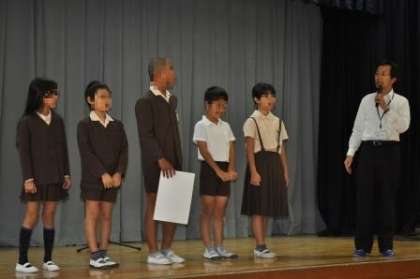昨日は、扇町公園で北区民カーニバルがありました。リレーやかけっこ、玉入れや綱引きなど、菅北小学校の子どもたちもいろいろな競技に参加しました。小学生リレーに出場した4〜6年生のチームは、頑張りが実って第3位になることができました。表彰状をいただいたので、今日の児童朝会で表彰しました。表彰状をもらった児童だけでなく、拍手をしていた児童たちも、みんなたいへん嬉しそうでした。