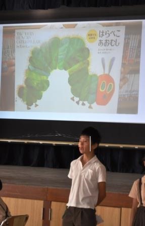 自分のお気に入りの本を紹介するのですが、お気に入りの場面を大画面で表示して、その理由を述べるなど、工夫を凝らした「さすが高学年!」と思えるような発表でした。