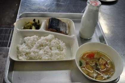 給食にかかわるすべての方々、すべての食材に感謝して、今日の給食もおいしくいただきました。今日の献立は、さばのみそ煮・五目汁・きくなとはくさいのおひたしでした。
