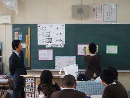 2/14(火)、進学先の天満中学校の数学科甲斐先生が本校に出向いて6年生に数学の出前授業をしてくださり、子どもたちは中学校数学授業の雰囲気に触れることができました。6年生は、11月には天満中学校を訪れ、中学校で授業を受けています。