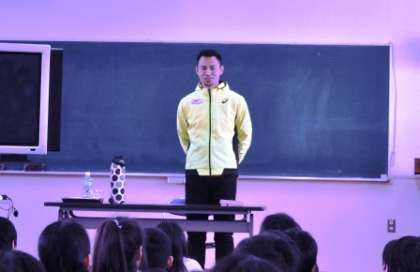 講演では、自分の幼少時の体験をもとに、夢に出会うこと、そしてそれを実行に移し本気でがんばることの大切さを語っていただきました。また、感謝の気持ちを持ち、それを伝えることで夢に近づくことも教えていただきました。選手時代の映像を見せていただいたり、日本選手権での金メダルに触らせていただいたりもして、児童はたいへん喜んでいました。