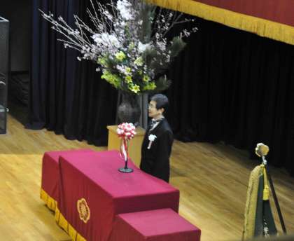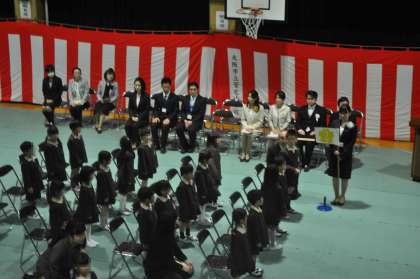 緊張した面持ちの新1年生37名が会場の講堂に入場すると、会場は大きな拍手に包まれました。式辞や祝辞では緊張していた新入生も、一つお兄ちゃん・お姉ちゃんになった新2年生による歓迎の演技が披露されると、これから始まる小学校生活に胸を膨らませ、小さな瞳を輝かせていました。