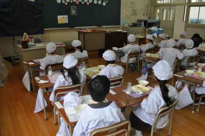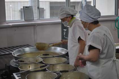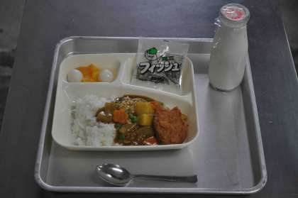 4/11(火)より給食が始まりました。1年生にとっては、小学生になって食べる初めての給食です。当日の給食は、「入学祝い献立」でした。メニューは、カツカレーライス・フルーツ白玉・ミニフィッシュ・牛乳です。子どもたちに人気のメニューで、入学や進級をお祝いしました。カレーライスには、給食調理員さんがニンジンを星形に切った「ラッキー・ニンジン」を入れてくださいました。これは、給食を楽しく食べることができるようにするための工夫です。1年生にも、「小学校の給食はおいしい!」と評判でした。