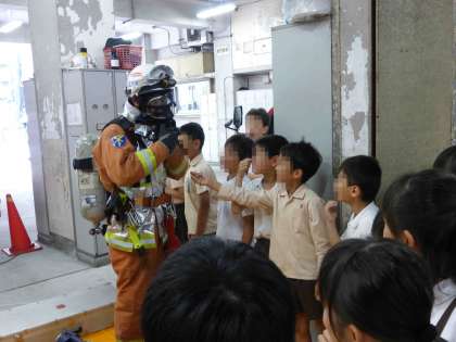 最後の写真は、実際の救助訓練を実演してくださっているようすです。北消防署のみなさん、大変勉強になりました。ありがとうございました。