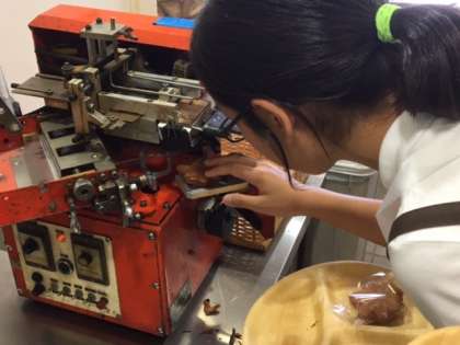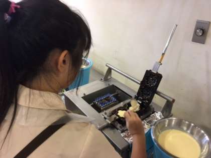 昼食後は、宮島名物もみじ饅頭の手焼きに挑戦しました。もみじ饅頭を焼くなんて初めての体験です。手焼きなので、焼き上がりもそれぞれ微妙に異なります。焼き上がったばかりの世界で一つのオリジナルもみじ饅頭を、機械を使ってラッピングしました。また、その場ですぐに食べた焼きたてのもみじ饅頭は、格別の味です。
