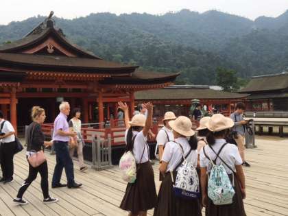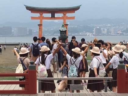 もみじ饅頭手焼き体験を終えてから、厳島神社見学に出かけました。厳島神社は、社会科の教科書にも登場する平清盛が再興した神社で、世界遺産にも登録されています。資料集で見るのと、実際に自分の目で確かめるのは大違いです。