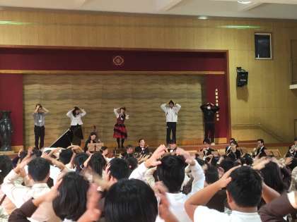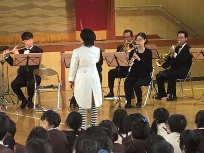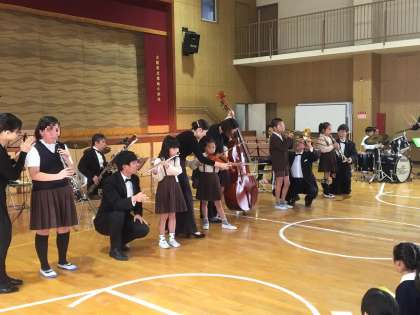 前半と後半の間に休憩時間があり、その時間を利用して、各学級の代表1名がオーケストラの楽器(ピアノ、クラリネット、フルート、バイオリン、コントラバス、トロンボーン、トランペット、ドラム)の練習をしました。短時間の練習でしたが、後半の部の最初には「かえるの歌」の合奏をみんなの前で披露しました(写真上)。