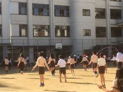 11月13日(月)から、なわとび月間がスタートしました。なわとび運動を継続して行い、回数の増加や技の習得をめざし、進んで運動を楽しめるようにすることがめあてです。12月1日(金)までの毎日、2時間目と3時間目の間の15分休憩の時間に、奇数学年と偶数学年とに分かれ、隔日で実施します。なわとびカードも用意しています。初日の11/13は、奇数学年の子どもたちが音楽に合わせ、なわとびに励みました。