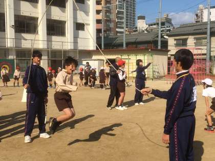 天中生の職場体験2日目は、登校してくる児童を玄関で迎え、朝のあいさつをすることから始まりました。15分休憩には、なわとび月間で行っている大なわ跳びの補助もしてもらいました。