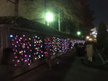 先月、全学年の子どもたちは、果実袋に思い思いの笑顔を描く「ひかりの実」を制作しています。その時の作品が、「OSAKA光のルネサンス」会場に展示されているのです。場所は、バラの小経(東洋陶磁美術館北側の堂島川沿い)。作品制作時とはまた趣が異なり、子どもたちの描いた笑顔は、作品の中に入れたLEDに照らされて、とても輝いています。