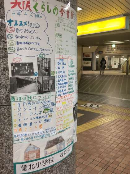 子どもたちは、地域の見学に出かけたり、インターネットや図書で調べたりして「天満の魅力」に迫りました。そして、グループごとに調べた「天満の魅力」を外国人など観光客に伝えようと、ポスターにしました。
