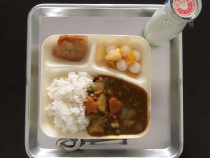 本年度給食2日目の4月11日(水)は、「入学お祝い献立」でした。メニューは、カツカレーライス、フルーツ白玉、牛乳です。
