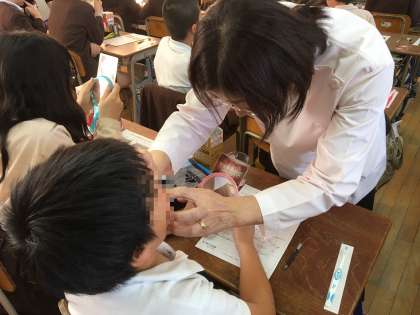不十分な歯磨きで落としきれなかった歯垢が虫歯や歯周病の原因になることや、歯周病を自分で見分けて予防することを教えてもらいました。また、歯の染め出しをして自分の歯磨きがきちんとできているかどうかを調べました。歯の健康を守ることの大切さがよく分かる学習でした。