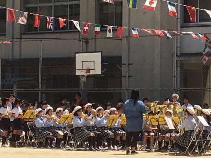 また、競技が始まる前には、菅北ジュニアバンドによる演奏もありました。本年度、初めての演奏会、新入部員にとっては初の舞台です。ジュニアバンドOBの中学生も駆けつけ、一緒に演奏してくれました。