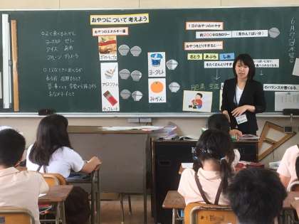 6月7日(木)、北区の栄養教諭を招き、4年生と5年生に栄養指導を行いました。4年生では「よくかんで食べよう」(写真上)、5年生では「おやつについて考えよう」(写真下)というテーマでの授業です。