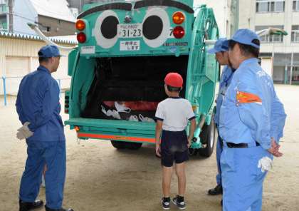 写真上はパッカー車を動かしているところです。ごみを押しつぶし、一度にたくさんのごみを運べるパッカー車にとても驚いていました。写真中は映像を見せてもらいながら地球の温暖化など環境問題について学習しているところです。写真下はクイズ形式でごみの分別を体験しているところです。