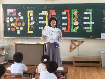1年生のテーマは、「たべものの なまえを しろう」です(写真上)。給食には、いつもたくさんの食べ物が入っていること、そしてそれはいろいろな種類の食べ物を食べることが大切だからということを学習しました。