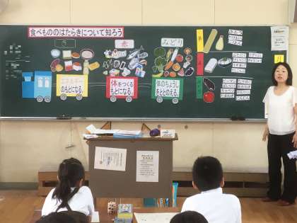 2年生のテーマは、「食べもののはたらきについて知ろう」です(写真下)。食べ物は、エネルギーのもとになるもの(黄)、体をつくるもとになるもの(赤)、体の調子を整えるもの(緑)に分けられること、そしてそれらをバランスよく食べることが大切なことを学びました。ワークシートの「今日の学習で分かったことや、これからがんばろうと思うことを書きましょう」の欄には、「すききらいしないで、これからのこさず食べたいです」というような感想が多く見られました。