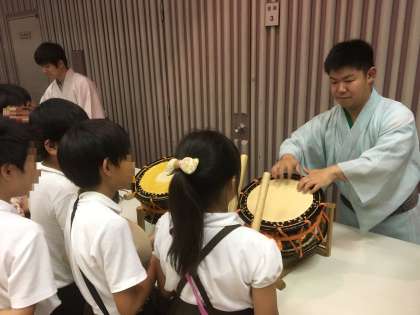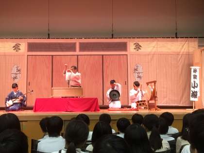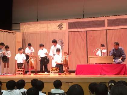 その後、幕が開き、舞台上に高座が現れると、寄席お囃子教室の開講です。最初にお囃子の紹介がありました。続いて、各校の代表が舞台に上がり、落語家や囃子太鼓を体験しました。高座に上がり、噺をしたのは中学校の2年生。本校の卒業生も登場し、大いに盛り上がりました。