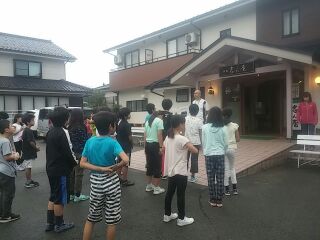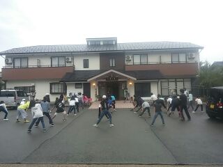 今日は宿舎前で朝の集いを行いました。昨日、あれだけ活動してクタクタだったのに、一晩ぐっすり寝て、みんな元気モリモリです。