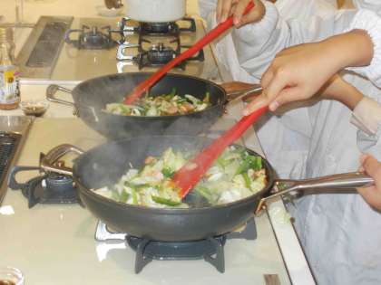 下の写真は、エコ・クッキングに挑戦しているところです。エコ・クッキングは、食べ物やエネルギーを大切にする、水を汚さない、ごみを減らすなど、地球環境を考えながら「調理・食事・片付け」を体験するプログラムです。できるだけごみを出さないよう野菜を切ったり、出汁を取るのに使ったカツオ節でふりかけを作ったりして、エコの大切さを学びました。ごはんを鍋で炊く、みそ汁の具に旬の野菜を使う、野菜炒めをするのに捨ててしまいがちなニンジンの皮やキャベツの外葉を無駄なく使うなど、子どもたちにとっては、ただ作って食べるだけでなく、地球環境について考える機会となりました。