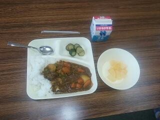 今日は、給食試食会を行いました。献立はビーフカレーライスときゅうりのピクルス、桃の缶詰でした。