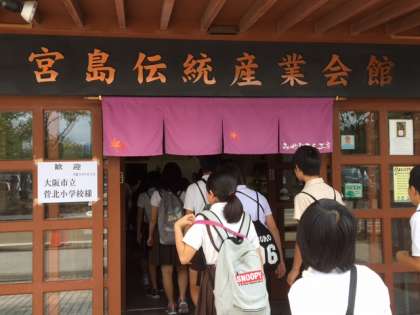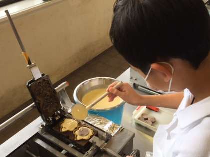 昼食をおいしくいただいた後は、宮島名物もみじ饅頭の手焼きに挑戦しました。こしあんとチョコ入りのもみじ饅頭をそれぞれ2個ずつ作りますが、どの子も初めての体験です。