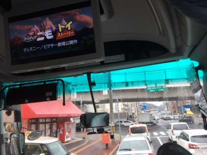 帰りのバスはビデオ鑑賞タイム。ただし、見るのは自由なので、この二日間の疲れで、早速眠る子も。