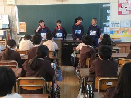 また、6年生には授業をしてくれました。これは5か月後には中学生になる6年生に、中学校生活の実際について話すとともに、6年生からの質問に答えるというものです。6年生は、8月に中学校の先生から中学校生活の話を聞いていますが、現役中学生の先輩から聞く話は新鮮でした。