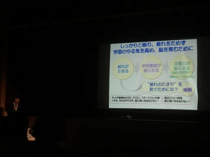 また、朝から食欲を高め、朝食をしっかりとることや、学習の様子から「ほめる」ことを大切にすることもお話されました。「早寝・早起き・朝ごはん」が言われるのは、このような科学的根拠があるんだということがよく分かった講演でした。