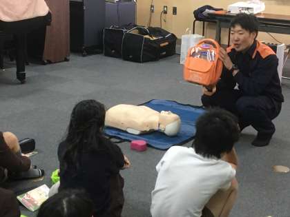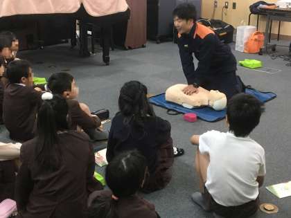 5年生は消防隊員による「救命入門コース」を受講しました。心肺蘇生の行い方やAEDの使い方を学びました。心肺蘇生の練習もしました。