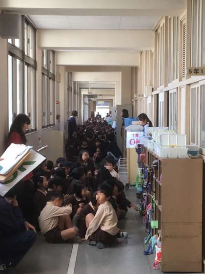 後半は、大地震の発生と津波を想定した避難訓練と児童引渡し訓練です。