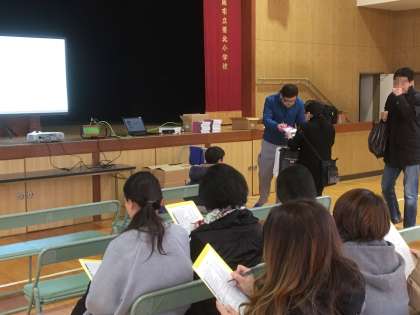 この間に、保護者のみなさんには北区役所作成の防災ビデオを視聴いただき、『大阪北区ジシン本 −「地震」が起きても「自信」をもって「自身」をまもる−』を受け取ってもらいました。