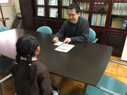 今、すべての段において学級担任の先生から合格をもらった子どもたちが、ちょっぴり緊張しながら校長室にやって来ます。校長先生に九九を聞いてもらって、合格すれば校長先生から「かず名人」の賞状がもらえるのです。休み時間になると、校長室はたくさんの2年生でいっぱいです。