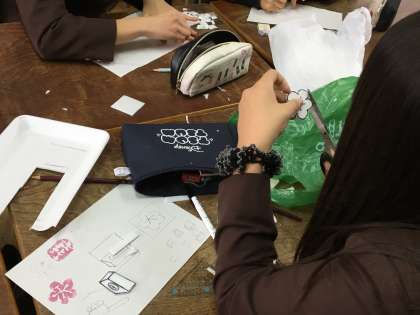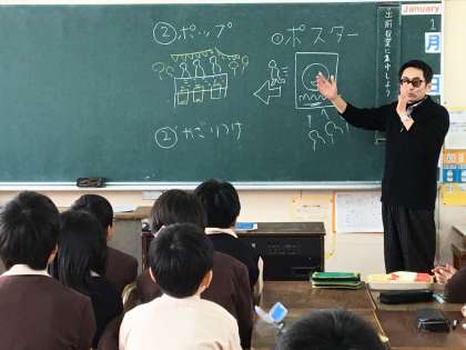 1月15日(火)、天神橋筋六丁目商店街に関わっていらっしゃるアートディレクターの宗倉良知さんをゲストティーチャーとしてお招きし、集客の工夫としてのポップ(商店などで用いられる販売促進のための広告媒体)について、お話を聞かせていただきました。お話を伺った後、ポップを作成する際に用いるスタンプを、実際に作ってみました。作ったスタンプは、「梅の花びら」と「商品のイラスト」をデザインしたものです。梅の花は、菅北小学校の校章にデザインされてる、菅北小学校のシンボルです。