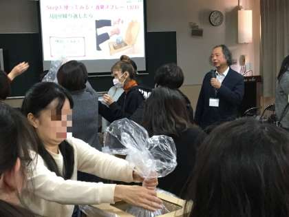 今後30年以内に南海トラフ巨大地震が発生する確率は80%であると言われる中、北区役所では、いつ起こるか分からない地震や水害に備える『大阪北区ジシン本』を作成しました。今回は、本書作成に関わった方々を講師にお招きして、本書に関する講話をお聞きしました。また、簡易トイレの使い方や災害時のスマートフォン活用方法をワークショップを通して学びました。