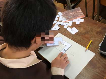 2月14日(木)、天満中学校の数学科 野崎先生が本校に出向いて6年生に数学の出前授業をしてくださいました。ペントミノ(5つの正方形を辺に沿ってつなげた形)を組み合わせて、長方形を作る授業です。