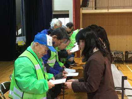 当日は、朝の見守り活動を終えてから、見守り隊のみなさんが学校にお越しくださいました。児童会からは、お礼の言葉と手作りの感謝状が見守り隊のみなさんお一人お一人に贈られました。
