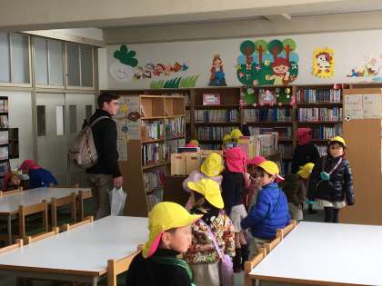 交流会後、園児たちは、校内を見学して回りました。入学式を行う講堂や広い校庭、図書室を見てもらいました。幼稚園の子どもたちは、今回の小学校訪問で、以前にも増して4月の入学を楽しみにするようになったことと思います。