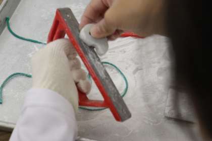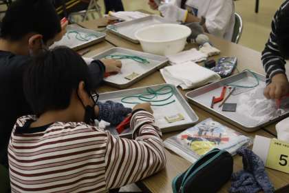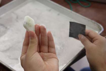 四角い石の形から勾玉を作っていくのですが,子どもたちはヤスリを使って削るのに意外と力がいるので大苦戦!