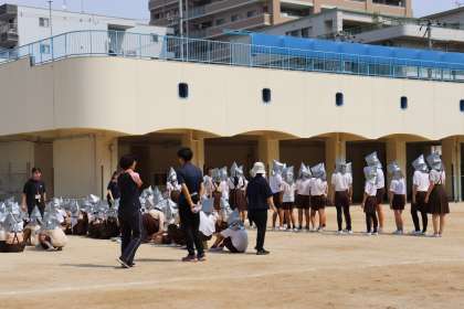 避難する時に大切なこと「お(押さない)は(走らない)し(しゃべらない)も(もどらない)」を守って、すばやく運動場に集まることができました。