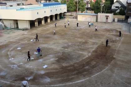 頑張っている子どもたちが,より力を発揮できるように,先生たちで放課後に運動場の砂ぼこりを押されるためのにがりをまきました。