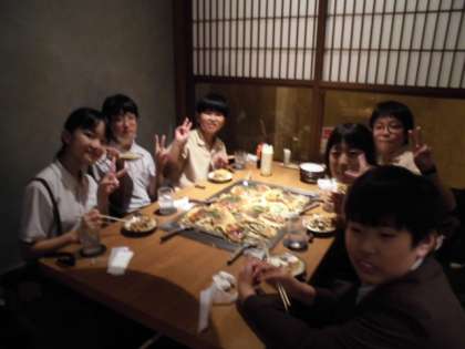 お昼ご飯に平和記念公園近くの鉄板焼き屋さんで,焼き立ての広島焼きを食べました。
