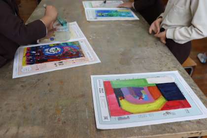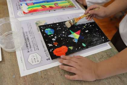 現在、図工は『くぎうちとんとん』の学習に取り組んでいます。くぎを打つ板に絵をかいて絵の具で色をつけ、乾いてからニスをぬりました。