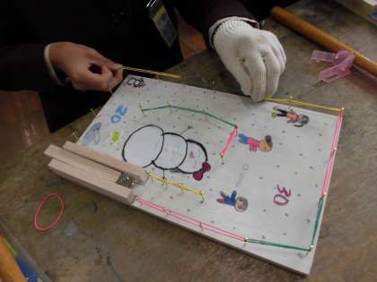 どこにくぎを打って、輪ゴムをかけたら楽しいゲームになるか、子どもたちは実際にビー玉を転がして確かめながら楽しそうに作業を進めていました。