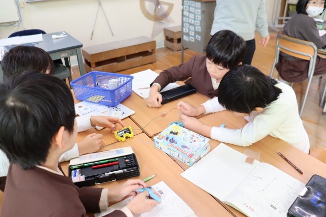 以前の学習で、乾電池と豆電球のつなぎ方を確認した後、回路の途中に鉄のゼムクリップをつないでも豆電球の明かりがつくことを学習しました。ゼムクリップ以外にどんなものが電気を通すのだろう?試してみたいものをたくさん挙げて予想し、今日実験を行いました。「なんとなく通らないと思う。」という生活経験からの感覚的な意見がありましたが、紙やペットボトル、おはじきに缶など様々なものを実験して試すことで、電気を通るものは金属の仲間だということに気づくことができました。